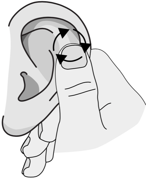 Delicately, hook your thumb into the center of the ar and press softly into the head. move your thumb in circles so the whole ear is affected.